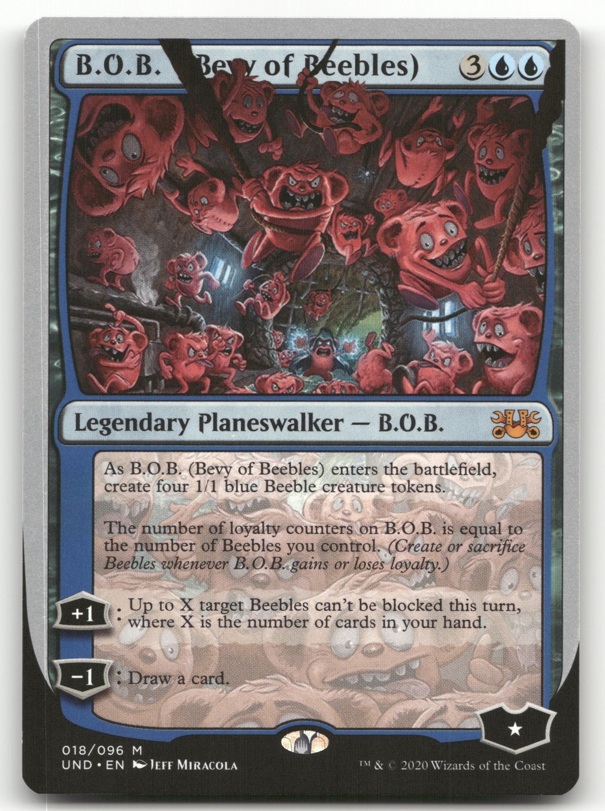 2020-02-29If B.O.B. gains loyalty, the Beeble you create is a 1/1 blue Beeble creature token.