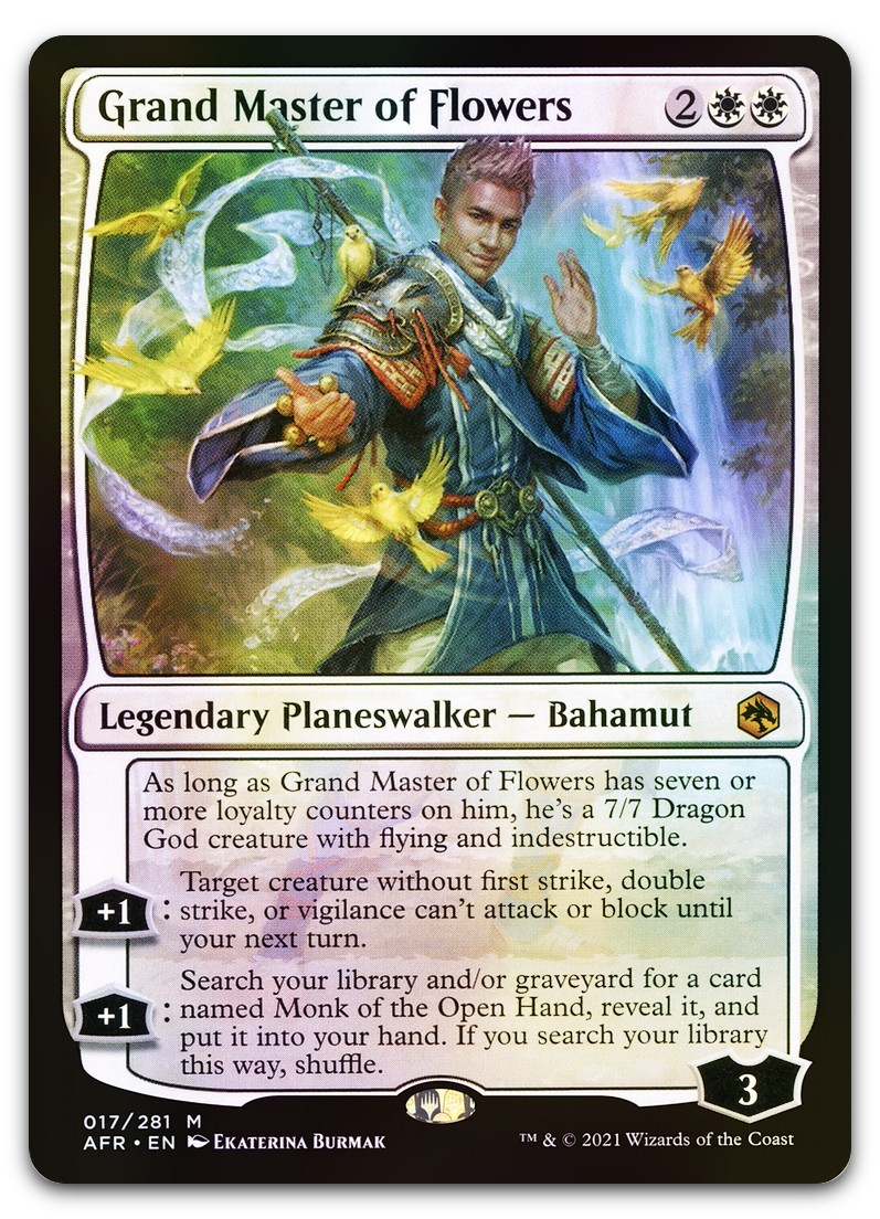 As long as Grand Master of Flowers has seven or more loyalty counters on him, he's a 7/7 Dragon God creature with flying and indestructible.